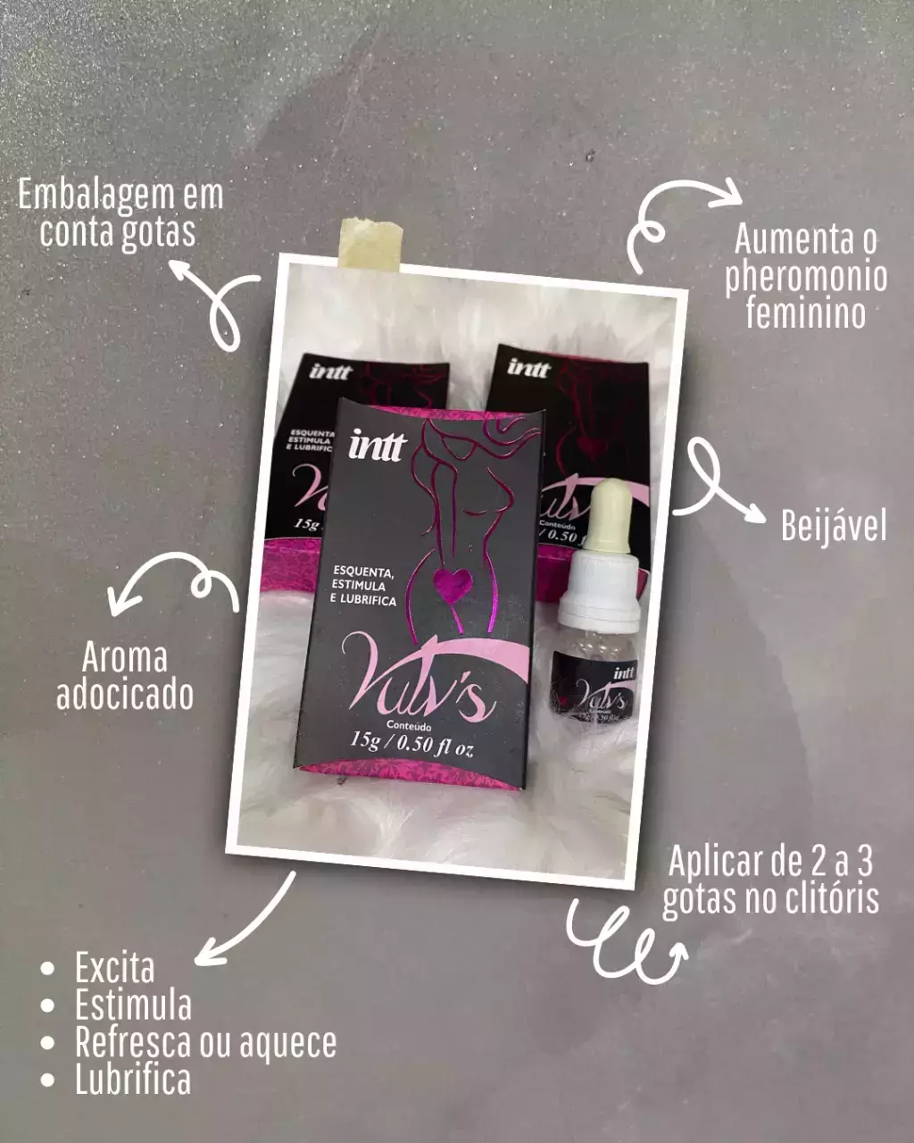 O produto ira aumentar a produção do cheiro natural da mulher o que é um atrativo para o sexo oposto, o produto vai esquentar ou esfriar dependendo da versão estimulando e excitando a mulher, além disso lubrifica a área aplicada.